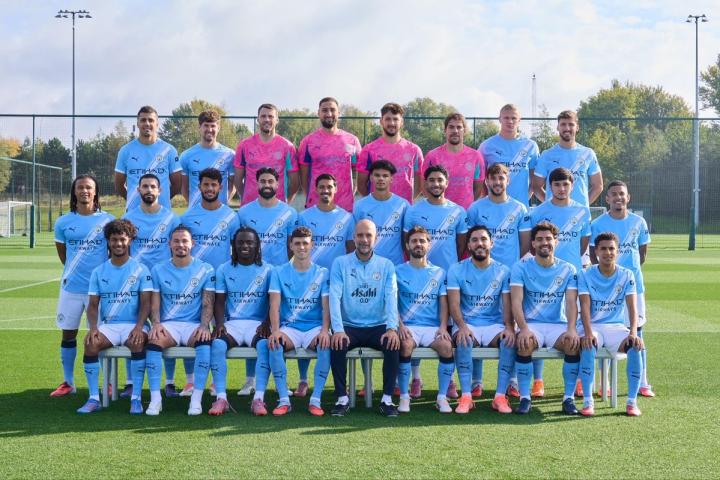 该合影由主教练瓜迪奥拉、教练团队及一线队全体球员共同参与拍摄,拍摄地点为城市足球学院。